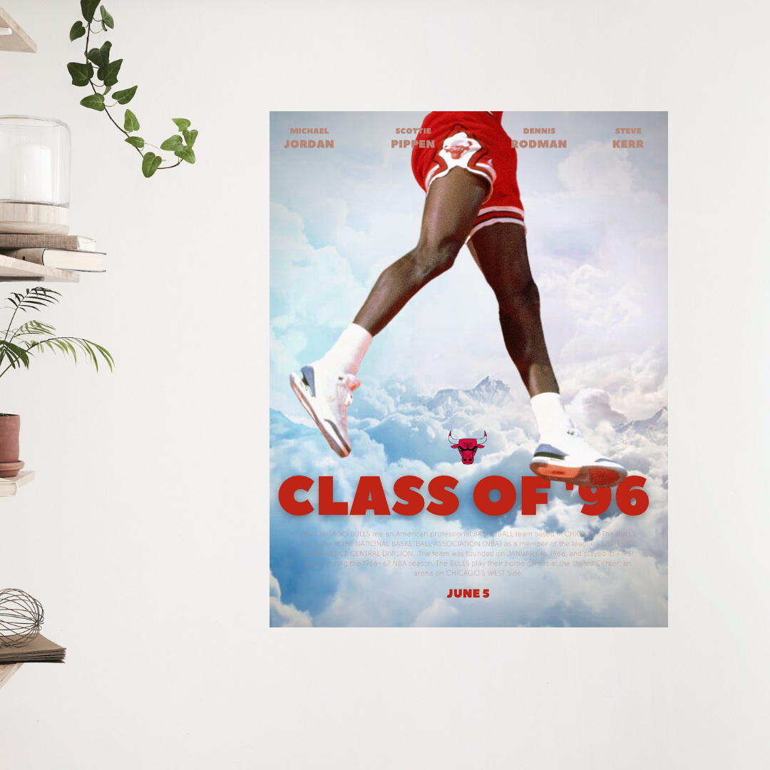 Celebrate your favorite Chicago Bulls players by displaying the Class of 96 Movie Inspired Poster in your bedroom, workspace, living room, or and more. 24x36 poster. Frame not included.
